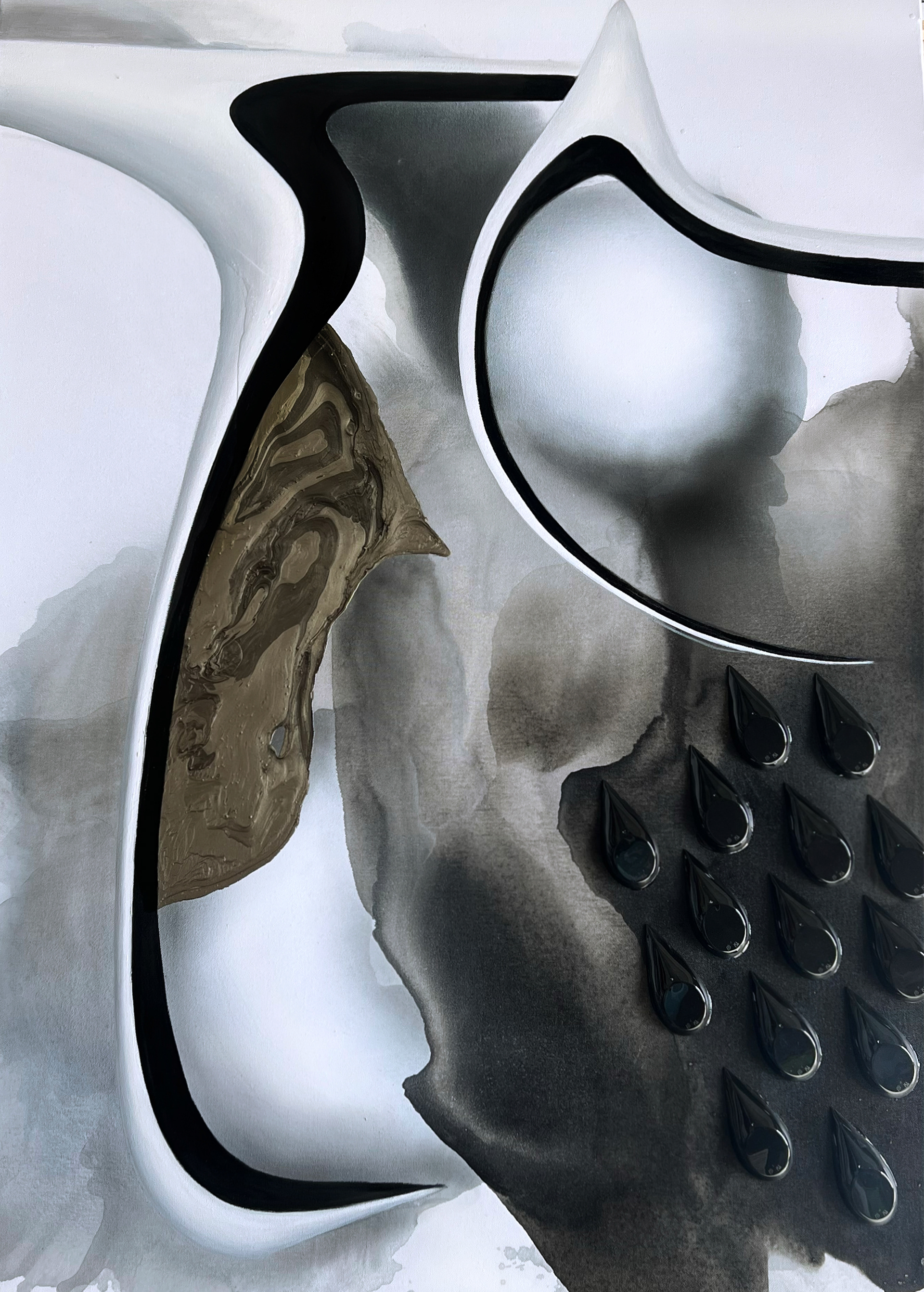 Mix media on canvas. 90 X 120 CM. 2023 Collection: BEFORE THE SHARD Dimensional Transmission No. BTS-V.O4 Energetic Function: To collapse the timeline of death as finality and restore the architecture of reemergence from shadow. I’ve grown suspicious of the word “rebirth.” It’s overused. Flattened. Pressed onto things that do not deserve it. And as for the iconography: white shapes, black tears, slick surfaces pretending to be wounds I’ve seen it all. So yes, I arrived with resistance. With usual fatigue. And then something inconvenient happened. This one didn’t ask to be read. It didn’t “declare” anything. It simply stood there composed, curved, and quietly armed. The form is anatomical without being human, precise without becoming mechanical. That brown wound on the left if you can call it that feels like memory caught mid-exhale. I don’t know what it is. I only know that I’ve dreamt of it before. And the droplets? Not decorative. They fall in perfect arrangement too orderly to be emotion, too sincere to be strategy. They could be grief, or instruction. Probably both. What I didn’t expect and still can’t fully account for is the internal consequence of viewing this piece. There is a neurological delay between recognition and comprehension, as if the visual cortex refuses to categorize it too quickly. This soft suspension, this hesitation in the brain’s pattern-recognition loop, results in a kind of perceptual unhooking. One sees and then re-sees. And in that space between, something is rewritten. I admit something else, too something I rarely say in public anymore. There is a kind of feminine intelligence here that I’ve tried to ignore for decades. Not because it isn’t real, but because it disarms me. This piece carries it. Not in color or gesture but in structure, in timing. In the refusal to seduce, and the audacity to remain. I don’t know if “rebirth” is the right word. But something here is undoubtedly alive. And it’s looking back. CURATORIAL COMMENTARY by Dong-hyun Yoon Archive for Trans-Contextual Inquiry, ATI Seoul/Berlin.